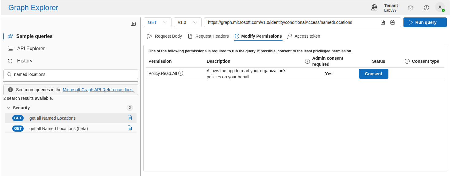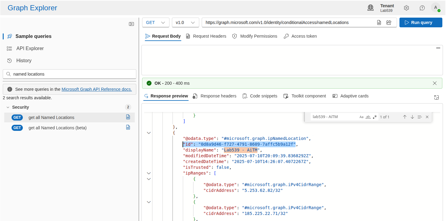 We are not aware of a trivial way to obtain the named location ID (if you know of one then please let us know!), so the most straightforward way we can think of is to use the Microsoft Graph Explorer. This is an online platform hosted by Microsoft that allows you to interact with the MS Graph API without the need to write any code. You’ll find it here: Graph Explorer | Try Microsoft Graph APIs - Microsoft Graph