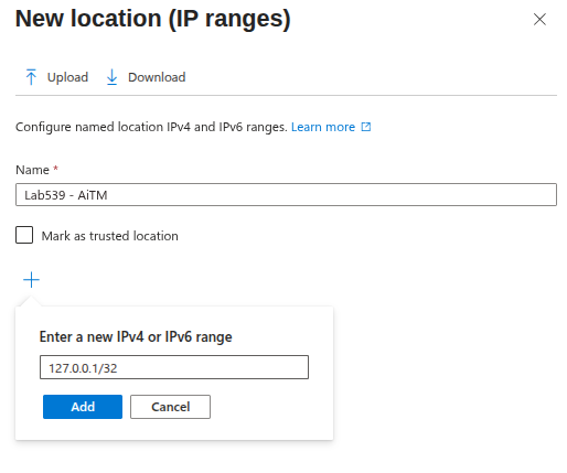 You should name your named location according to which feed it is consuming. For example if you are consuming the AiTM feed you should name it “Lab539 - AiTM”. Current options are shown in the table below: