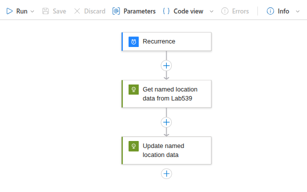 The v3.0+ codebase is far more streamlined and much more representative of how the managed service we provide. It simply makes two requests, one to obtain the latest named location data using your API key and one to push that data into your named location. This is what the Logic app designer looks like once you’ve imported the ARM template: